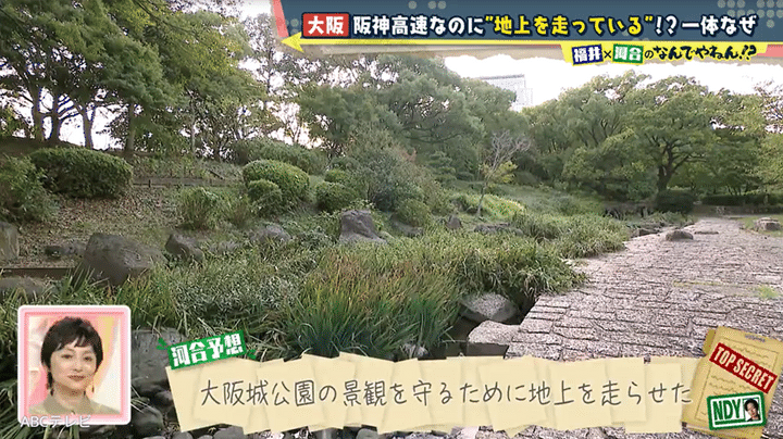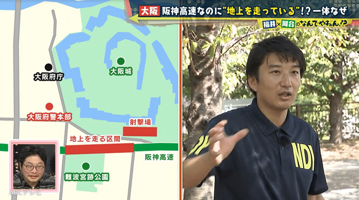 車から降りた河合は、高速の真横にある大阪城公園を福井アナと調査するなかで、「景観を守るために(阪神高速道路の一部区間は)地上を走らせた」と推測。一方福井アナは、陸軍から自衛隊に引き継がれた城南射撃場の跡を公園内で見つけ、周辺の建物の位置関係も加味して、「自衛隊や警察が利用しやすいように地上を走らせた」と考えた。