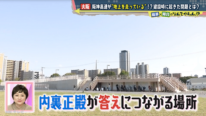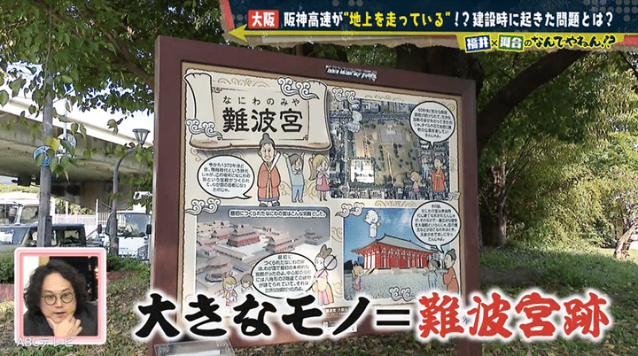 NDYの予想は、どちらもハズレ! 歴史探訪プランナー・森なおみさんいわく、1960~70年代の阪神高速道路建設時に、「ある問題が発生した」ため、法円坂~森之宮の約200メートルの区間を高架にできなかったのだとか。ある問題のヒントは、「大きいモノ」で、「答えはすぐ近くにあります」「めちゃ近にあるので見落とさないように」と、森さんは河合と福井アナにアドバイスした。
