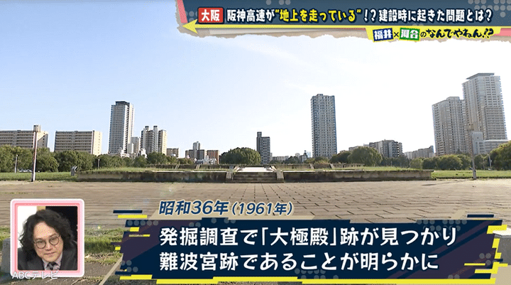 阪神高速道路南側にやってきたNDYは、難波宮跡公園で「めちゃめちゃデカい」ものを発見! その正体は、60年ほど前に行われた発掘調査で見つかった、大極殿(だいごくでん)跡をはじめとする難波宮の遺跡群だ。60年ほど前といえば、高速の建設時期と一致する。