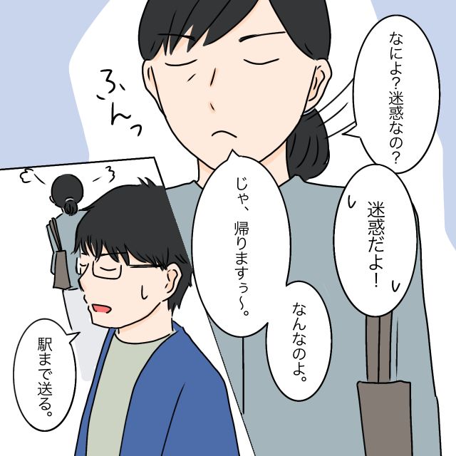 そして、「なによ?迷惑なの?」義母の言葉に、「迷惑だよ!」夫が力いっぱい答えると、「なんなのよ。じゃ、帰りますぅ~」そう言ってスタスタと部屋から出て行く義母。「駅まで送る」と夫が声をかけ2人とも部屋を出て行きました。