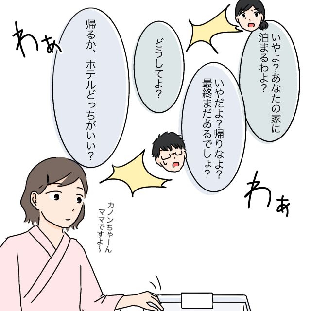 すると、「いやよ?あなたの家に泊まるわよ?」と義母が言い出し、「いやだよ?帰りなよ?最終まだあるでしょ?」夫がそう言うと、「どうしてよ?」と納得がいかない様子の義母。「帰るか、ホテルどっちがいい?」夫が二択を迫るなか、私はカノンをあやしていました。