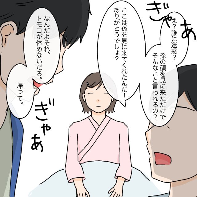 「え?誰に迷惑?孫の顔を見に来ただけでそんなこと言われるの?ここは孫を見に来てくれたんだ!ありがとう、でしょ?」と一歩も引かない義母に、「なんだよそれ。トモコが休めないだろ。帰って」と夫。