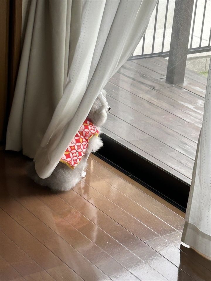 カーテンの影に隠れるようにして窓辺にいるこの子は、トイプードルの『ココ』ちゃん。 仕事に行っている飼い主さんの事をこうしてずっと待っていたのだそう。