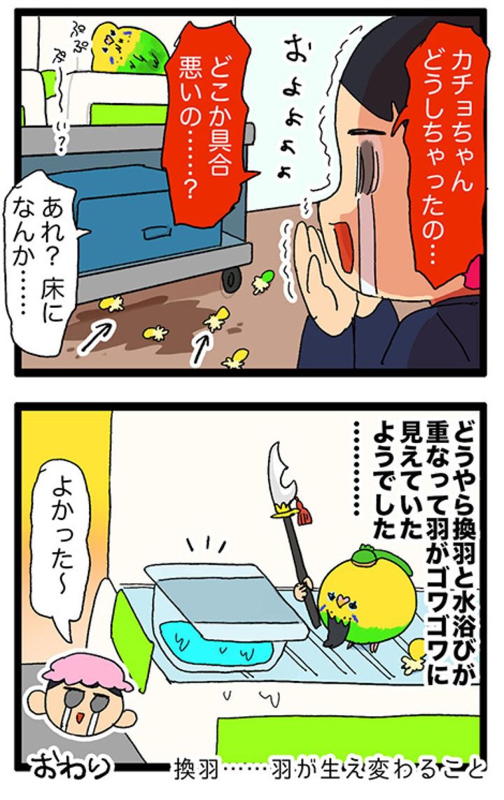 おやつを捨て、毛がゴワゴワ。少し心配になったカチョの一日【鳥マンガ #143】