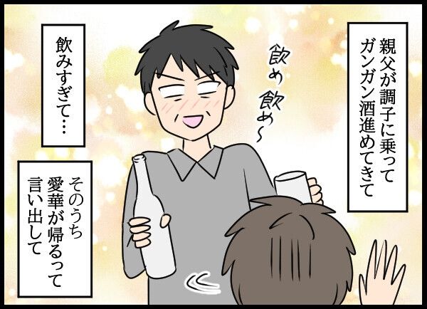 ・相手は隆司のお父さんじゃないの? 長く付き合っている年上の彼氏だし。 この説なら一人で実家に行ったときに愛華が来たのも、義父が過剰に酒を勧めたのも、隆司に送らせたのも、納得。