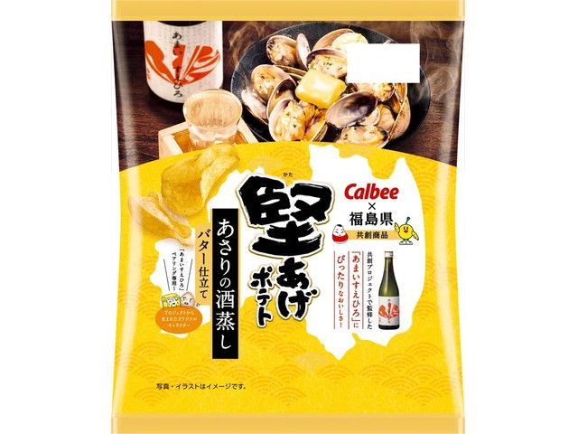 ●『堅あげポテト あさりの酒蒸しバター仕立て』は、磯の香り引き立つあさりの酒蒸しの味わいに、ほんのりとバター風味をきかせたコク深いおいしさが堪能できる商品です。 ●分かりやすい甘さを追求し、飲みやすく軽快に仕上げられた純米酒「あまいすえひろ」にぴったりな味わいに仕上げました。 ●パッケージは、「あまいすえひろ」とのペアリング訴求やコラボレーション商品であることがわかるように福島県のキャラクターや福島県の形、「あまいすえひろ」の画像を配置するなど工夫を凝らしました。