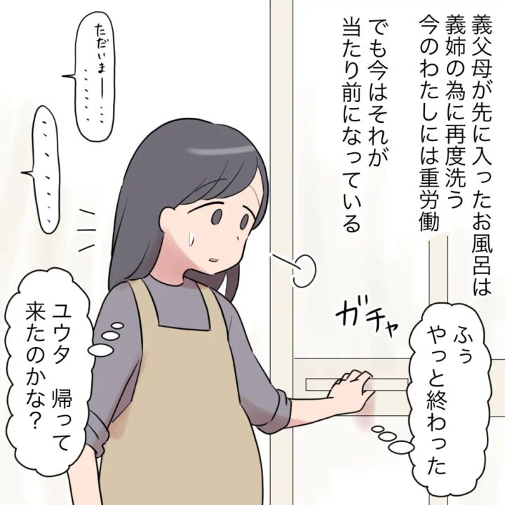 ユウタさんの実家で暮らすようになり、掃除・洗濯・食事などほとんどの家事を担うようになったカエデさんは、仕事から帰って来た義姉に「ごはん食べたらお風呂よろしく」と言われ、妊婦には重労働にも関わらず当たり前になっていたのでした。すると、仕事から帰ったユウタさんに、カエデさんの文句を言う義姉と義母。その話をドアの向こうで聞いていたカエデさん、理不尽なことしかない義実家に長く住むことは難しそうですよね。