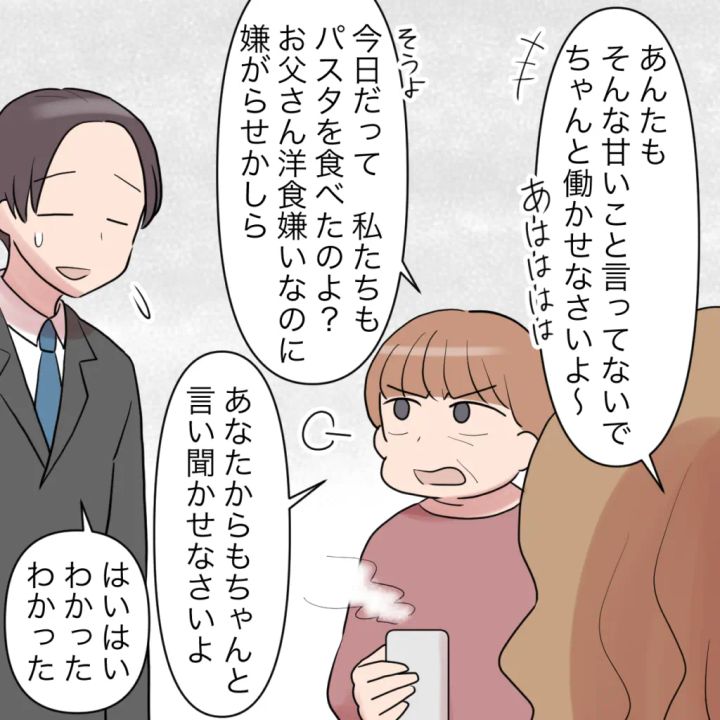 「あんたもそんな甘いこと言ってないで、ちゃんと働かせなさいよ~。あはははは!」義姉の言葉に、「そうよ。今日だって、私たちもパスタを食べたのよ?お父さん洋食嫌いなのに嫌がらせかしら。あなたからもちゃんと言い聞かせなさいよ」義母まで話に加わってそう言われ、「はいはい。わかったわかった」とユウタが呆れて言いました。
