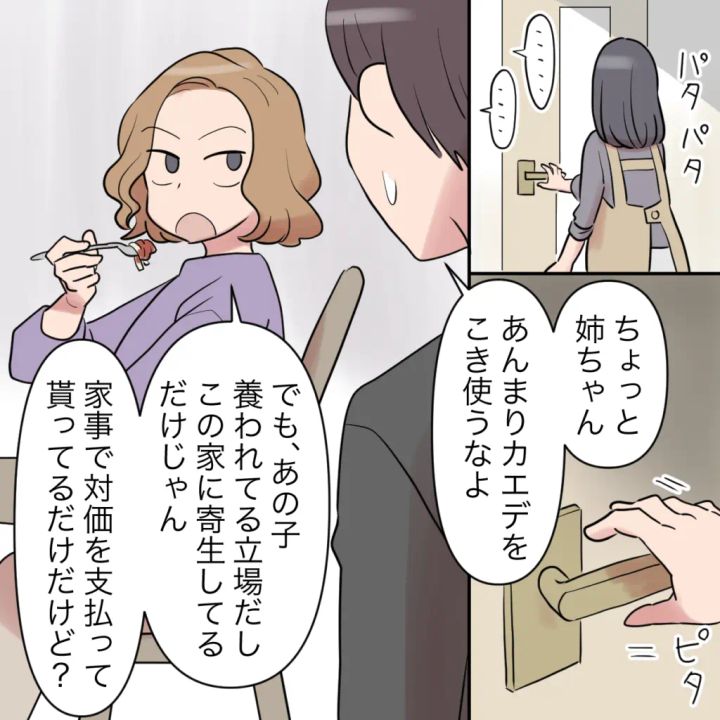 リビングのドアを開けようとすると、「ちょっと姉ちゃん、あんまりカエデをこき使うなよ」ユウタがそう言うと、「でも、あの子養われてる立場だし、この家に帰省してるだけじゃん。家事で対価を支払って貰ってるだけだけど?」と平然と言う義姉。