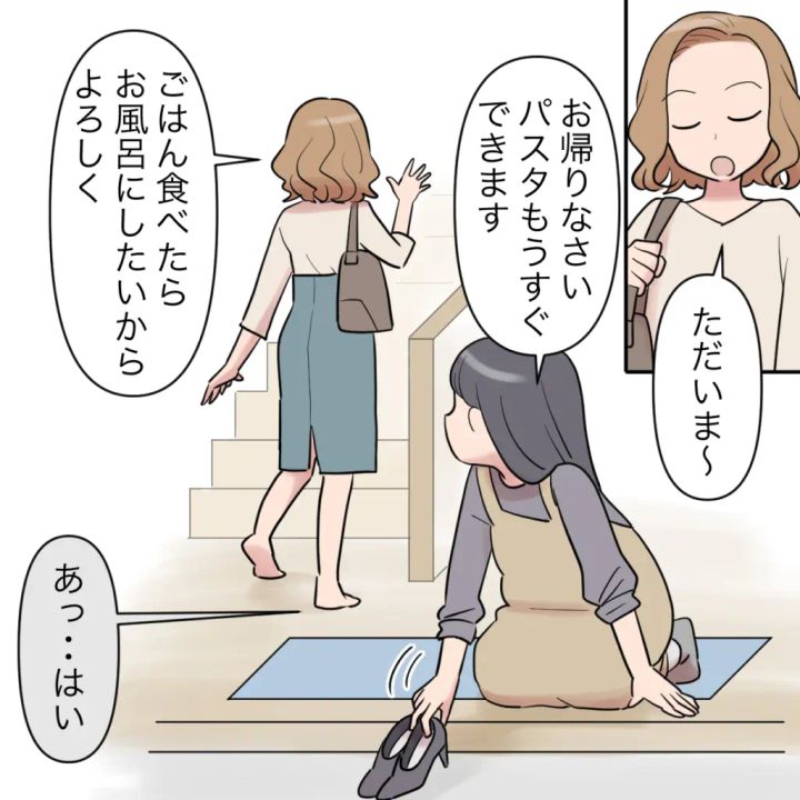 「ただいま~」帰って来た義姉に、「お帰りなさい。パスタもうすぐできます」と言うと、「ごはん食べたらお風呂にしたいからよろしく」と振り返りもせずに言われ、「あっ・・はい」と答えたものの、
