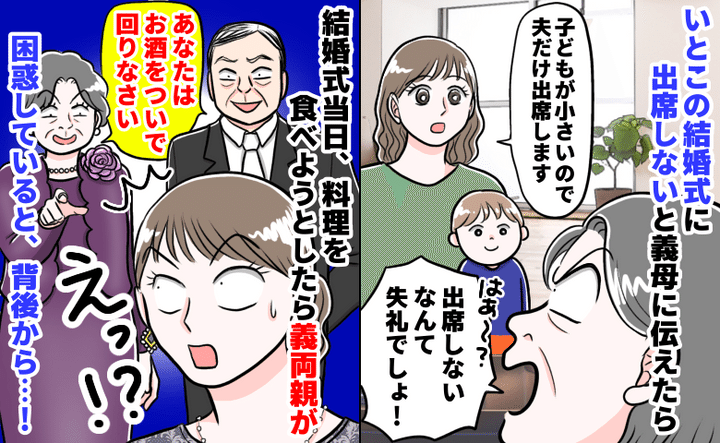 3. 「酒を注いで回れ!座るな!」義母に強制され子連れで結婚式へ。休む間もなくこき使われ…そのとき!?