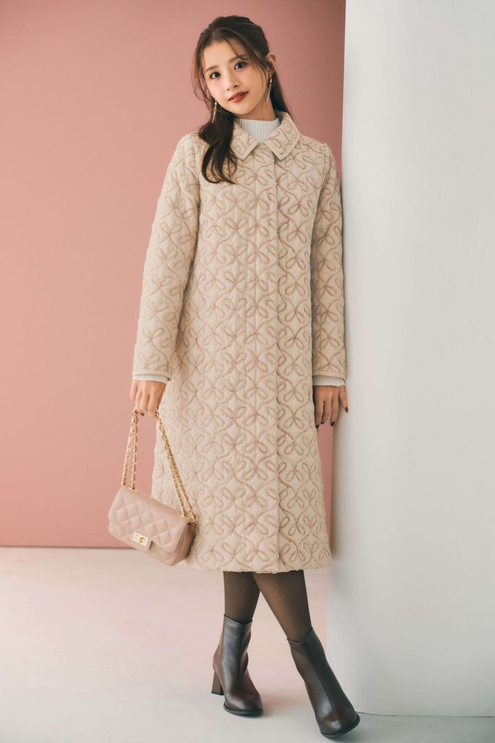 少し表情のあるタフタ素材に、モール糸でリボン柄を刺しゅうしながらキルト加工を施した、上品なステンカラーコート。立体感のあるモール糸が生み出す、ぬくもりのある風合いは冬にぴったり! ブランドオリジナルのリボンキルトが、大人の可愛らしさをさりげなく演出します。