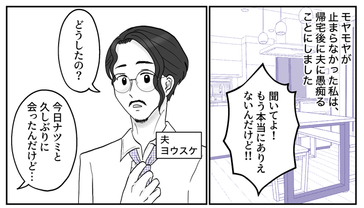 ナツミは「子どもを置いて泊まりは無理」と言うけれど、小学生にもなってそんなに手がかかるとは思えません。それは、やらないための言い訳にしか思えません。ヨウスケに話してもいまいち共感してもらえなくて、私はますますイラだちました。