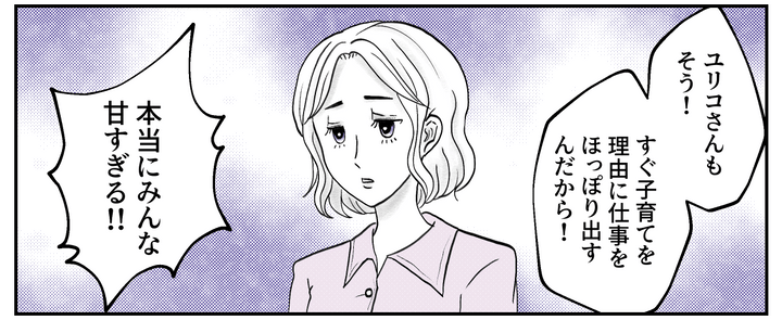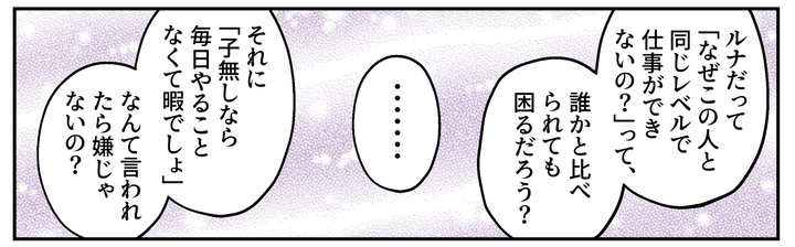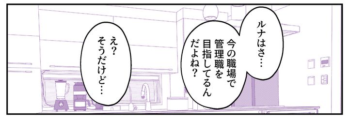 私はルナ。夫のヨウスケと暮らしています。最近私は職場で、チーム内に仕事を割り振るリーダー的なポジションにつきました。けれど、子育て中のメンバーは仕事を放り出して急に帰ることがあり、その責任感のなさに私はモヤモヤしています。そんなある日、久しぶりに学生時代の友人ナツミと会いました。私は良かれと思って、子ども抜きでの温泉旅行を提案したのですが……。ナツミには「もうやめよう」と話を打ち切られ、気まずい雰囲気になってしまったのでした。
