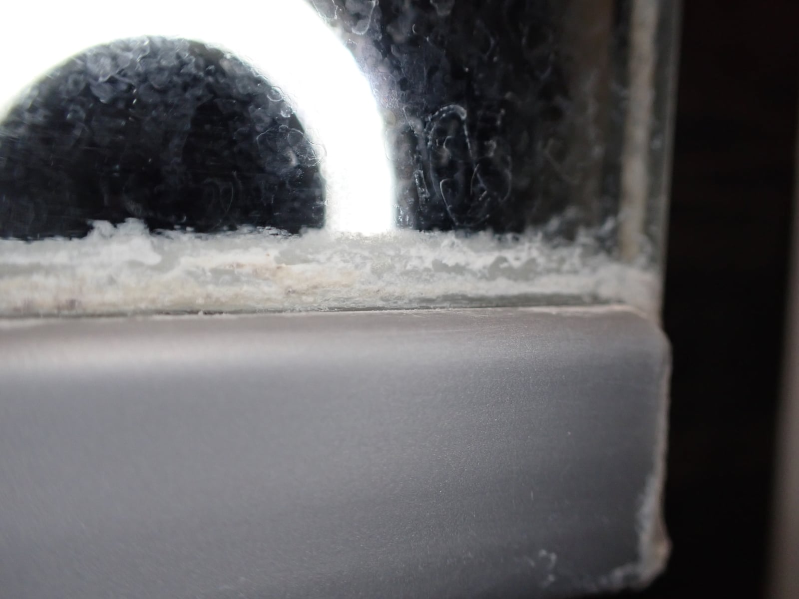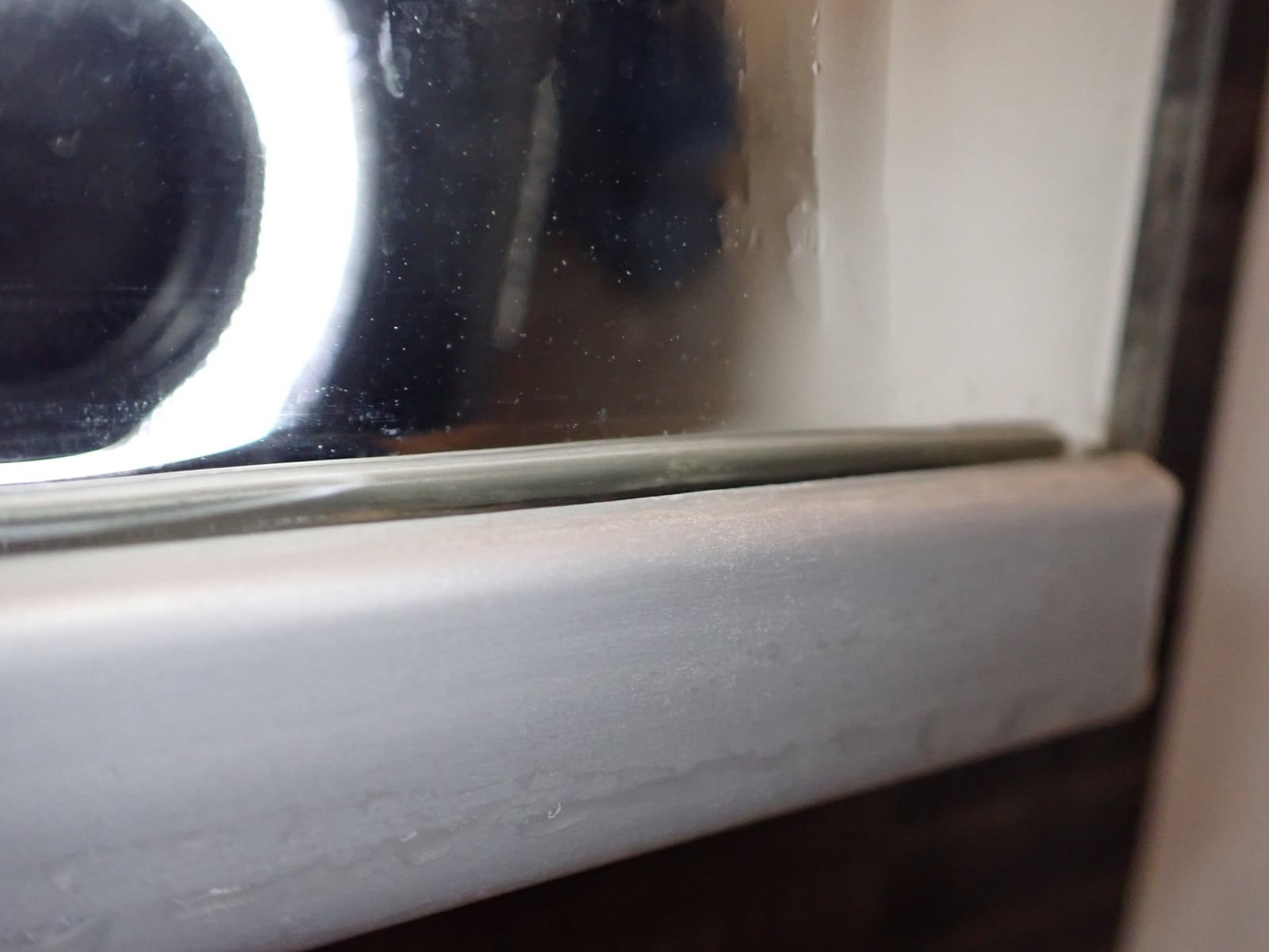 こちらが問題のカッチカチに固まってしまった水アカです。これが鏡の上下にビッシリと付着しています。これまでも何度かクエン酸つけ置きやプラスチックのヘラで落とそうと試みましたが、歯が立ちませんでした。それがなんと、カリカリ落としでキレイさっぱり落ちたんです。