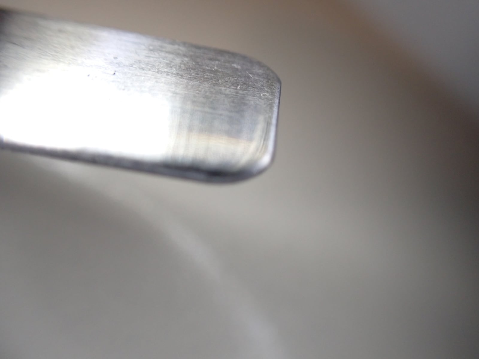 カリカリ落としの先端を水アカに当て、軽く押しながらスライドしていくと、面白いように取れていきます。つい力を入れがちになっちゃいますが、そこは我慢。傷がついたら元も子もありませんよね。
