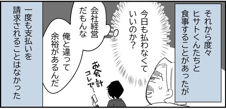 それから度々、ヒサトくんたちと食事をする機会があったが、一度も払ってくれと言われることはなかった。いやー助かる、助かる。俺は自分から支払うと言い出すことはしなかった。請求されたら払えばいいと考えていたんだ。