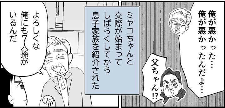 俺は田村シンペイ(60歳)。10年前に妻とは離婚。その妻との間にいた3人の子どもたちはもう成人して、それぞれ家庭を持っている。長年勤めている会社は勝手知ったる場なので、気楽に働いている。そんな俺は数年前にミヤコちゃんという女性と出会い交際することになったのだが。俺が不甲斐ないばかりにミヤコちゃんから「別れたい」と言われてしまった。悲しくて娘のリナにぼやいていたら、怒ってしまい。ミヤコちゃんの息子夫婦のところまで出向き、あろうことか金銭を要求し始め……俺はどうしたらいいんだ……。