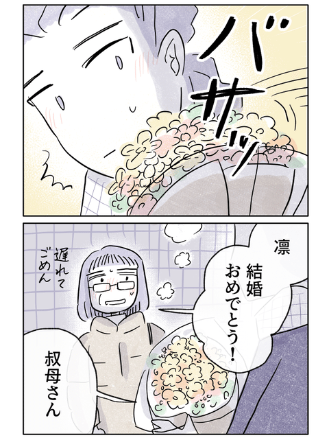 「結婚おめでとう」と、花束を手渡してくれる伯母。嬉しさで胸がいっぱいになる一方で、母から反対されている現実を思うと、素直に喜べない自分がいました。