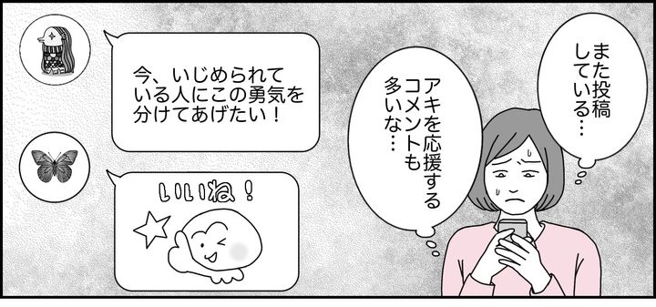 アキの投稿を見ていると、アキが抱えるいじめへの怒りや悲しみの深さを再認識しました。私は過去にいじめてしまったことを深く反省すべきだと思います。