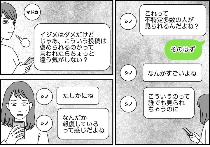 動画は不特定多数の人が見られるものであり、誰でも閲覧できます。マドカは内容について「いじめはもちろんダメだけど、こういう投稿が褒められるものかって言われたら、ちょっと違う気がしない?」と疑問を持っているようでした。私への報復のように感じる部分もあり、恐怖を感じます……。