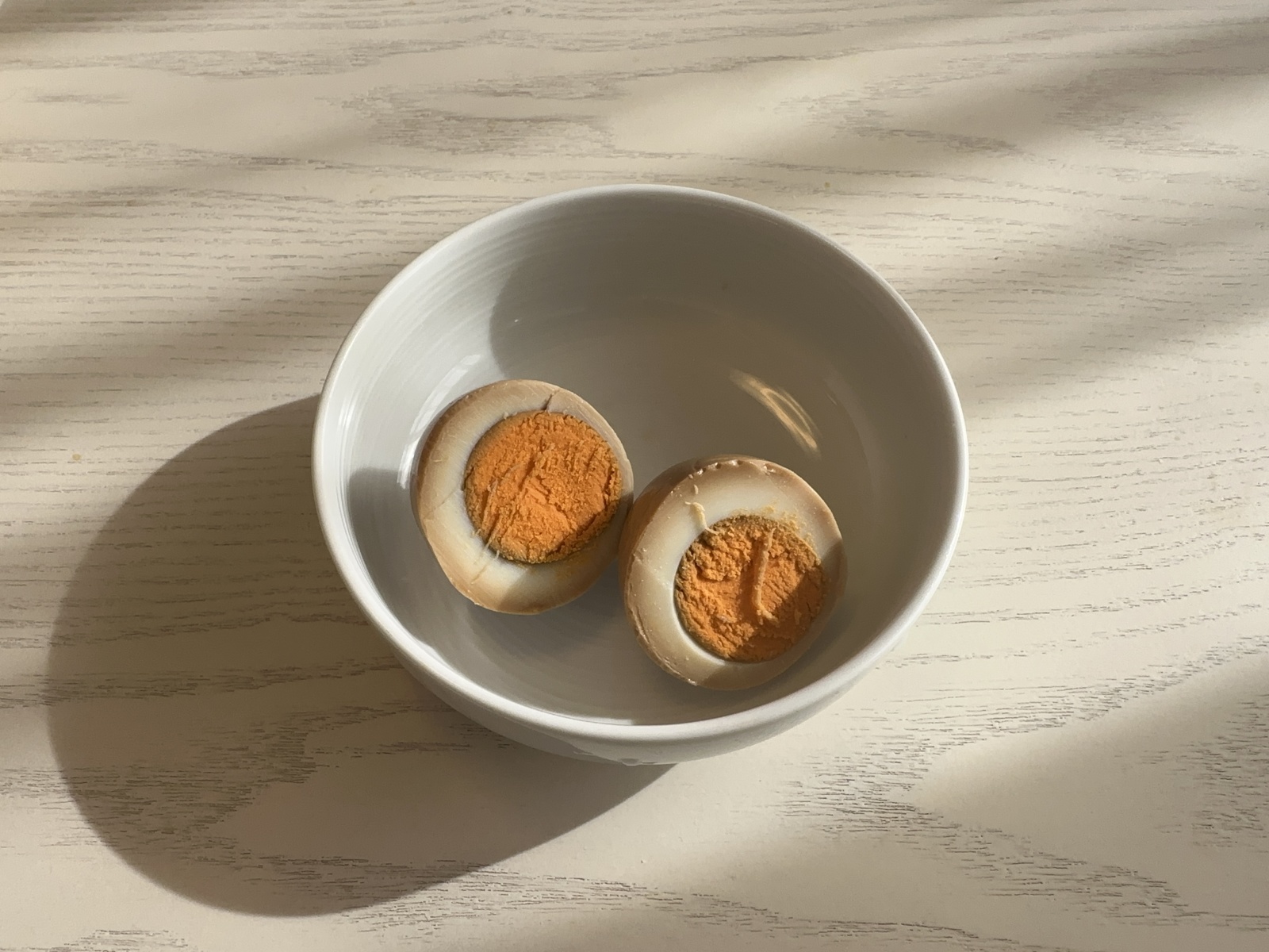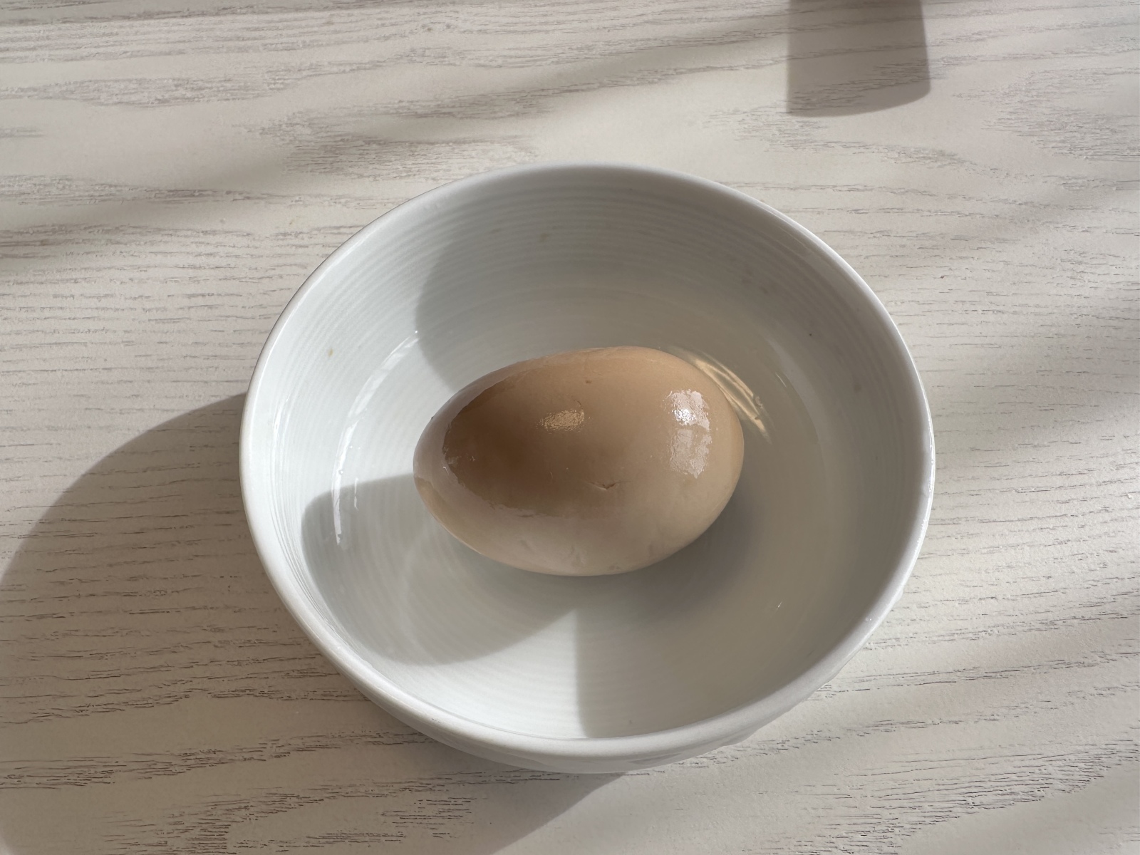 翌朝、ラップとキッチンペーパーをはがしてみると、味玉ができていました。しっかり均等に色づいていますね。