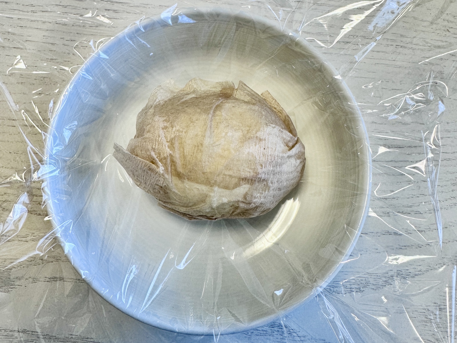 全体をラップでぴったりくるみ、余った部分をキュッとねじります。最後にクリップで止めて、冷蔵庫で一晩おきます。