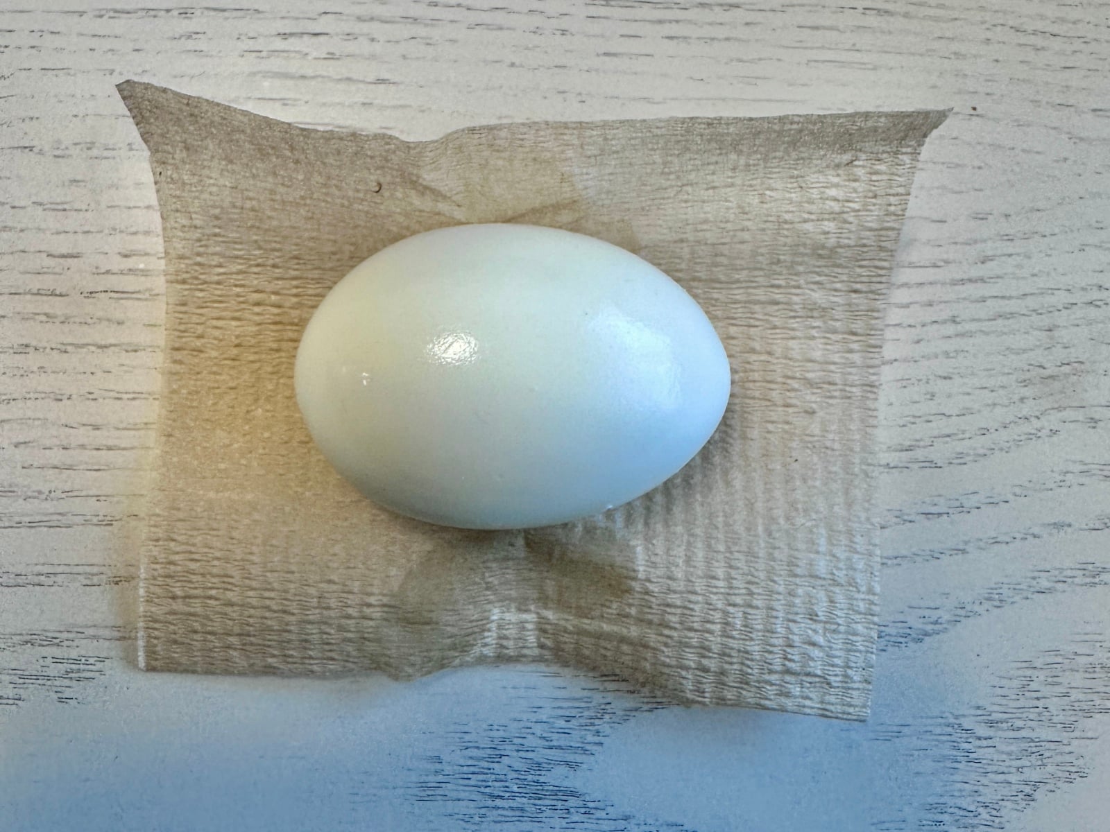 キッチンペーパーを、ゆで卵ひとつを包めるくらいの大きさにカットします。今回は4分の1にカットしたペーパー2枚を使ってくるみました。2個以上作るときは、1個ずつ包んでください。