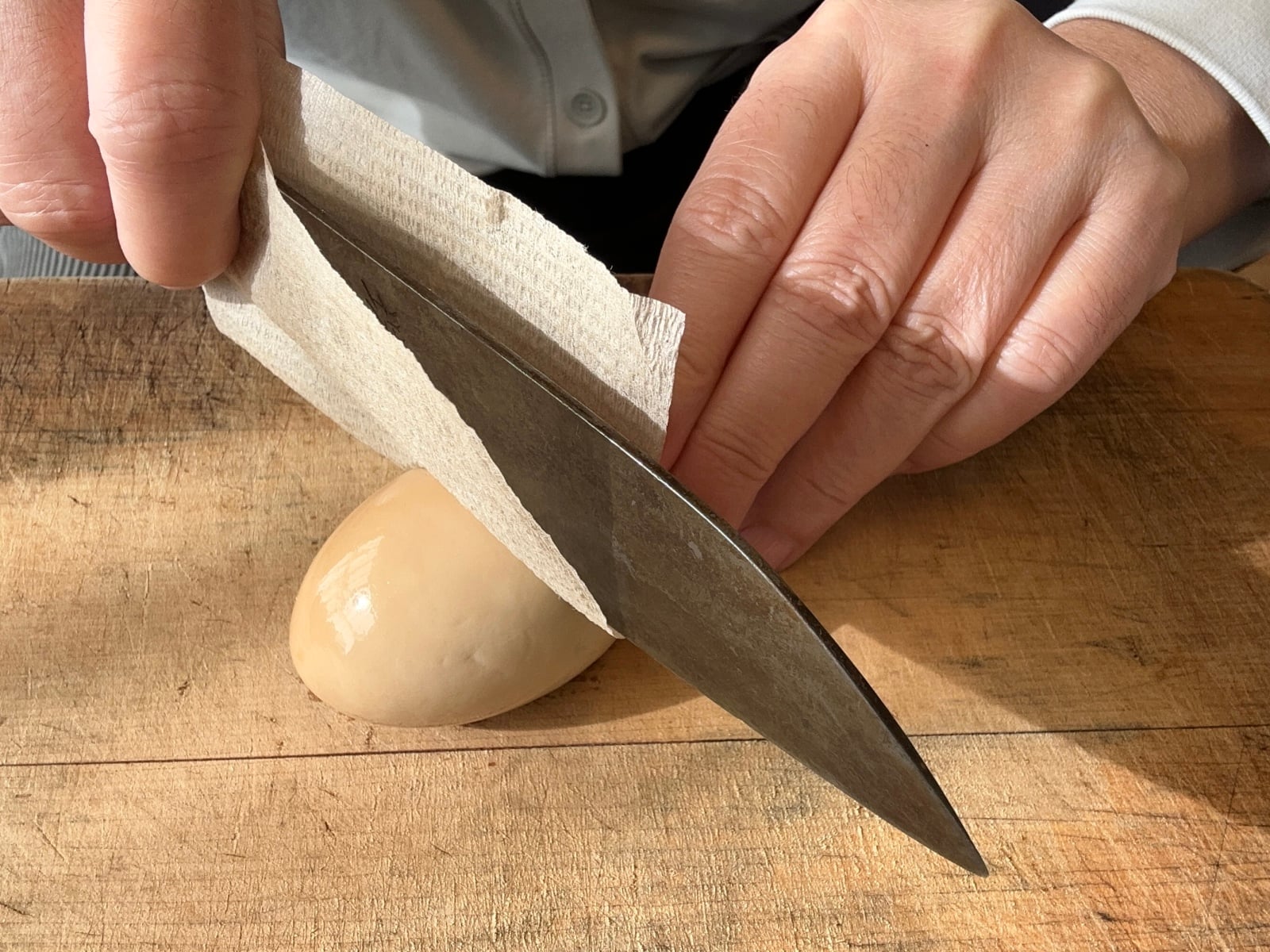 キッチンペーパーで包丁を挟みながら味玉を切ると、黄身で包丁が汚れません。