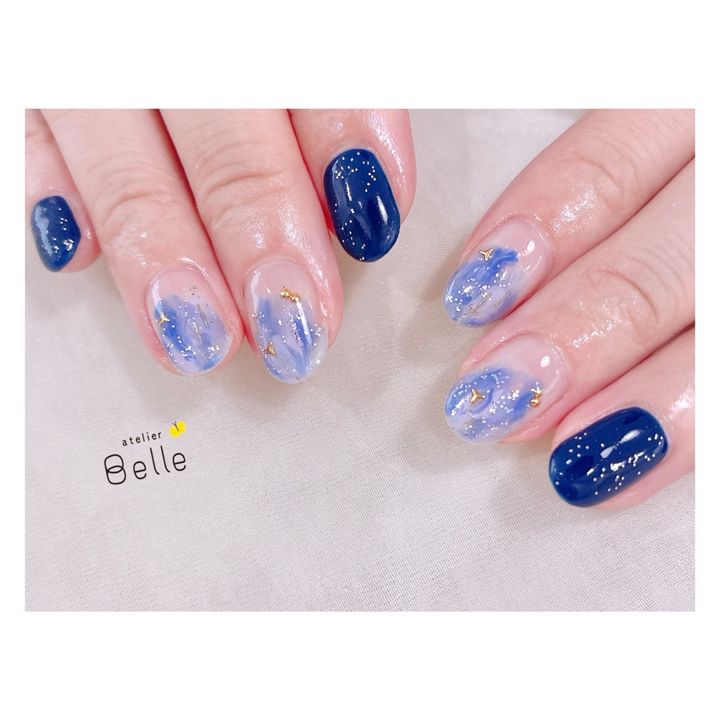 【ブルーネイル】トーンの異なる2色に散りばめられたゴールドがアクセント