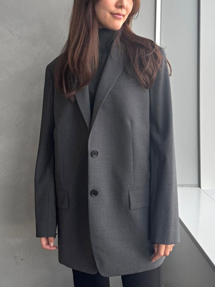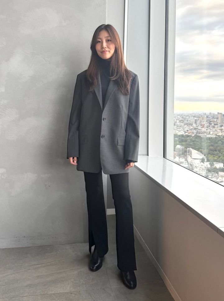 「オーバーサイズのジャケットを主役に、ダークトーンでまとめたハンサムなスタイリングに。細身のフレアパンツを合わせることですっきりとスタイルアップ見えするよう意識しました」