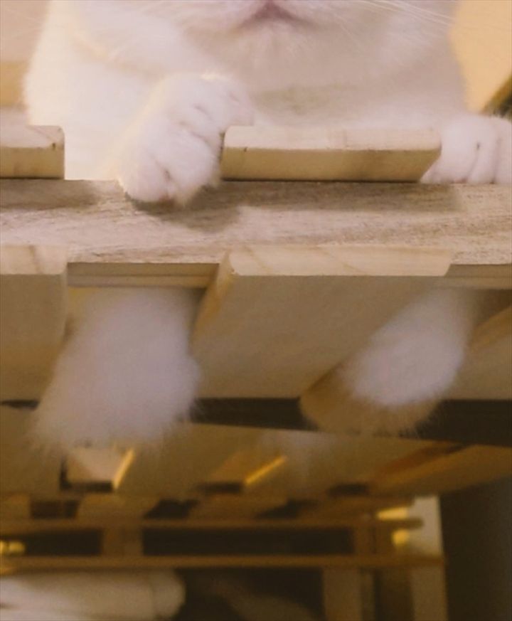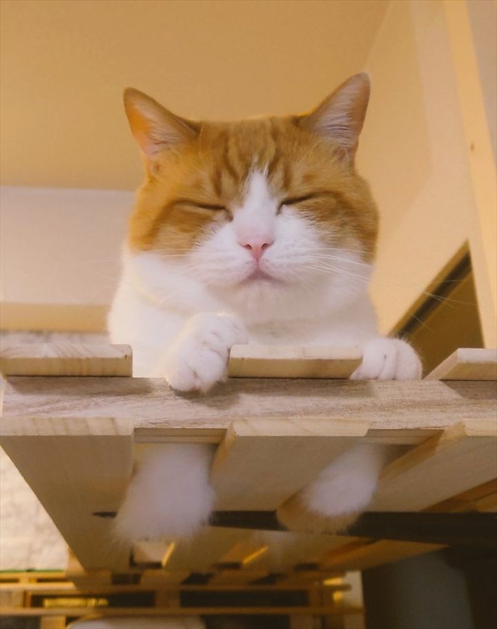 気持ちよさそうにスヤスヤと眠っているネコ。 格子状になったスペースでくつろいでいたため、おなかのモフモフ具合が堪能できました!