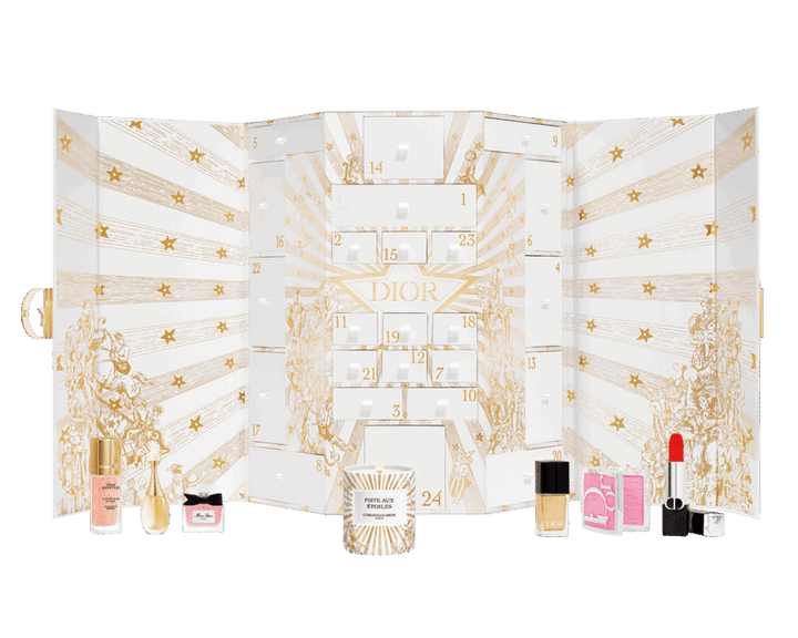 ディオール アドヴェント カレンダー ¥113,300(パルファン・クリスチャン・ディオール・展開店舗数量限定品)セット内容:ジャドール オードゥ パルファン 5mL、ジャドール ロー 3.5mL、ミス ディオール エッセンス 5mL、ミス ディオール ブルーミング ブーケ 5mL、ソヴァージュ 10mL、ディオール オム オードゥ トワレ 10mL、ラ ムース オフ オン 30mL、プレステージ マイクロ ユイル R セラム 10mL、プレステージ ラ クレーム N 15mL、ディオール カプチュール ル セラム 10mL、ルージュ ディオール 999V、同 720S、ディオール アディクト リップ マキシマイザー 001、同 グロウ 001、同 ティント 351、バックステージ ロージー グロウ 001、ディオールショウ マキシマイザー 4D、マスカラ ディオールショウ アイコニック オーバーカール 090、ディオール ヴェルニ 999、同 513、ラ コレクシオン プリヴェ ピスト オ エトワール、ツリーオーナメント3種