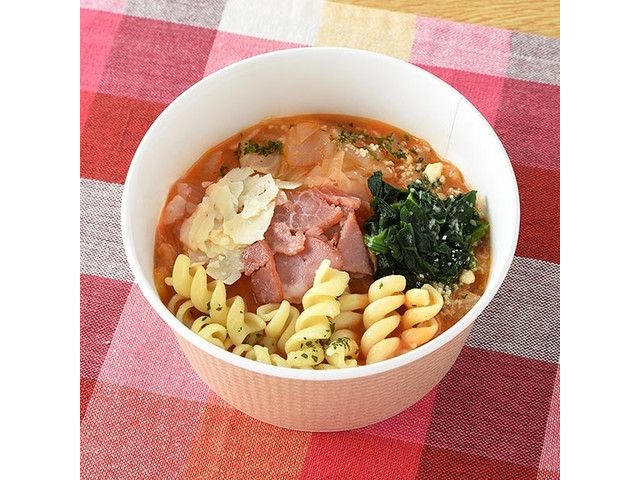 クリームやチーズのコクとトマトの酸味のきいた濃厚スープで、具材にはフジリ(パスタ)や野菜・ベーコンなどを使用し食べ応えのある仕立てです。