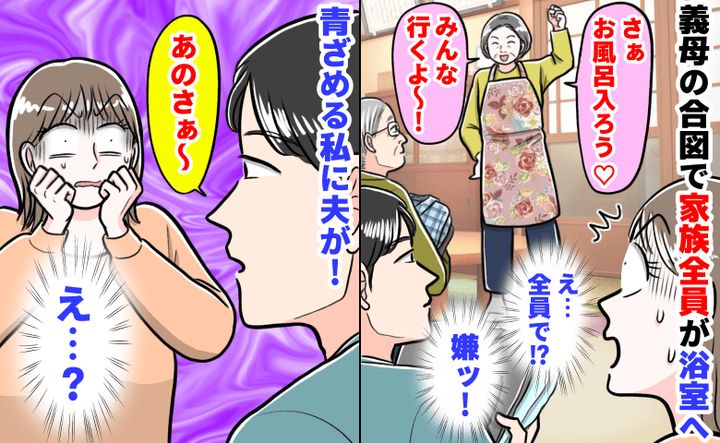 「さぁみんな一緒にお風呂入ろう♡」義母の合図で家族全員が浴室へ。え…嫌ッ!青ざめる私に夫がひと言!