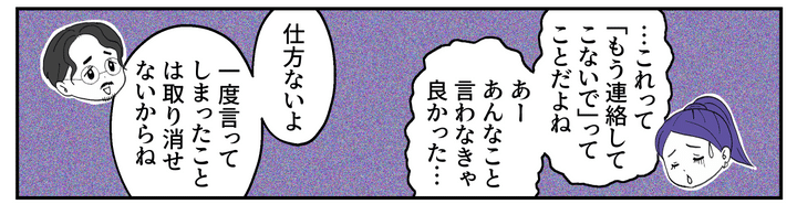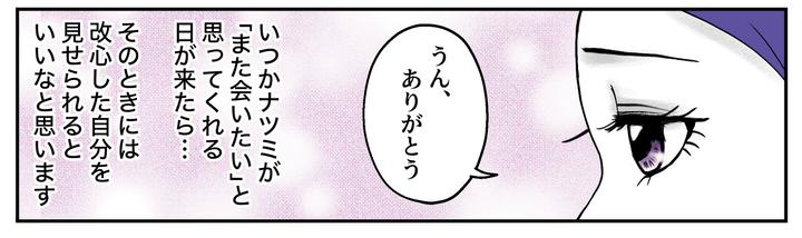 ナツミにも謝罪のメッセージを送ってみましたが……おそらく距離を置かれてしまったのでしょう。ヨウスケは「学生時代からの長い付き合いなら、いつかまた普通に話せる日が来るよ」となぐさめてくれたものの、そんな日が来るかはわかりません。けれどもしナツミが「また会ってもいいかも」と思ってくれたら、そのときには、新たな自分を見てもらえたらと思います。