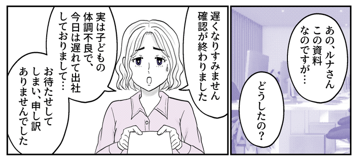 私はルナ。夫のヨウスケと暮らしています。最近私は職場で、チーム内に仕事を割り振るリーダー的なポジションにつきました。けれど子育て中のメンバーがあてになりません。ユリコさんは仕事を放り出して帰るし、やらない言い訳に「子育て」を使っているように思っていました。しかし私は久しぶりに会った学生時代の友人ナツミにその考え方をぶつけて、気まずい雰囲気になってしまいます。ヨウスケに諭され、私はとても失礼だったと気付いたのでした。