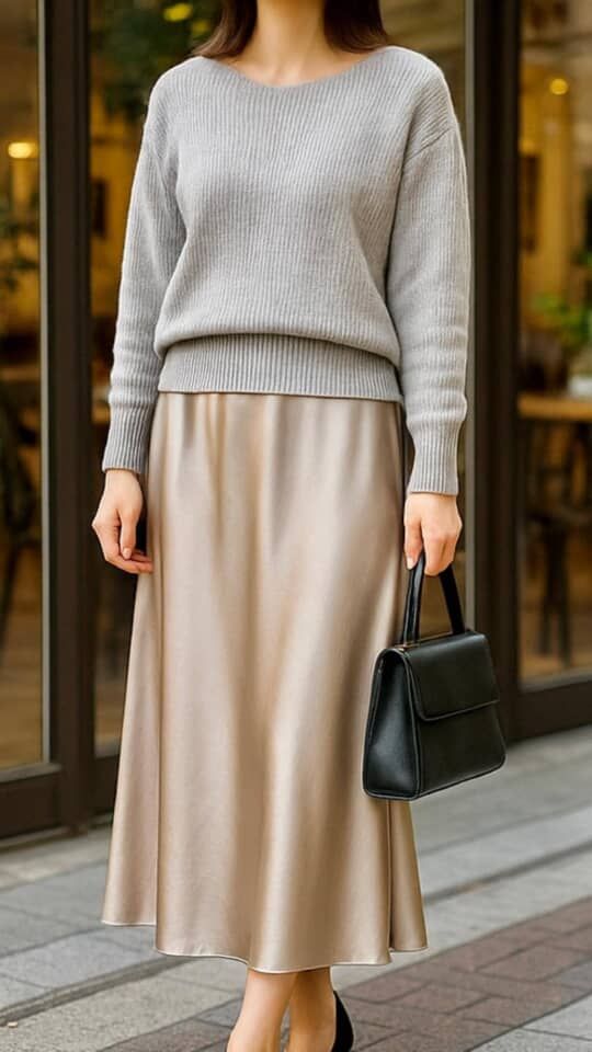 今季は、ツヤやハリのある素材をどこかに取り入れるのが正解。光沢ニットやサテン風スカートを一点投入するだけで、肌映えも若返り効果も抜群。シンプルでも“素材で魅せる”のが2025秋冬のトレンドです。
