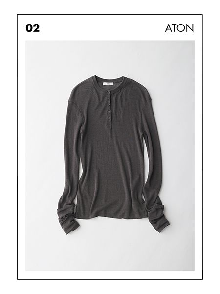 チャコールニットトップス/ATON(ATON AOYAMA) とろみのある素材でカジュアル感をオフし、女性らしく着られるヘンリーネック。ボタンはマットな着色。