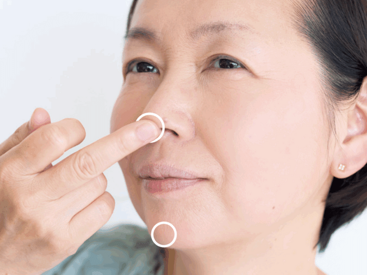 鼻先、唇の山谷、あご先に置いてなじませて。「顔にメリハリがつきます」
