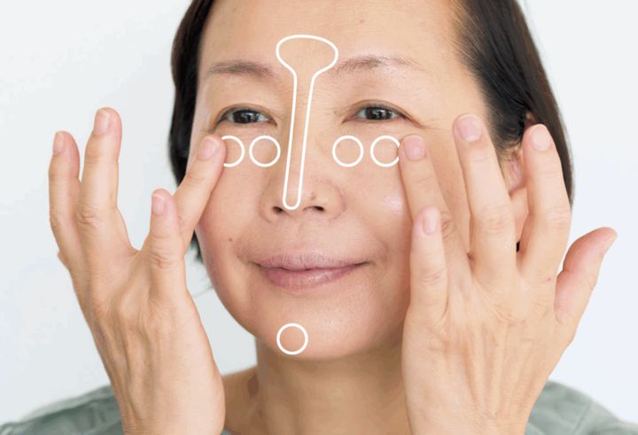 淡いほうの色を中指の先に少量を取り、眉間、目頭の間、目の下から頬骨の高いところ、目尻とこめかみの中間に。