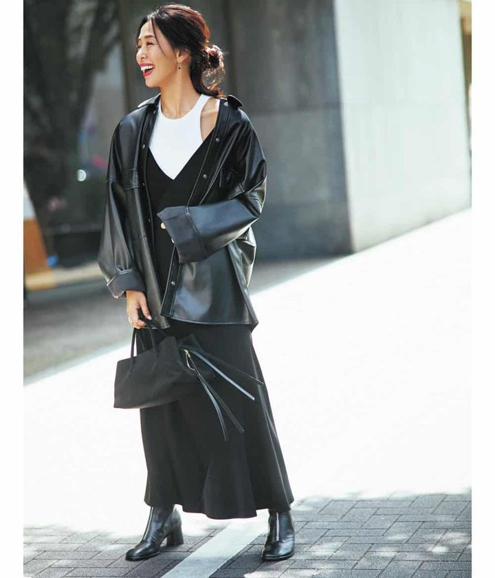 今季はレザーやレースなど、ドラマチックな素材感がトレンド。手持ちの甘服やコンサバアイテムとエッジの効いた新作をMIXするとじわじわオシャレ見え!定番ロングワンピもレザーアウターのツヤ感でリッチな表情に。黒を選べば簡単なうえ、主張しすぎないのにここまで華やか。