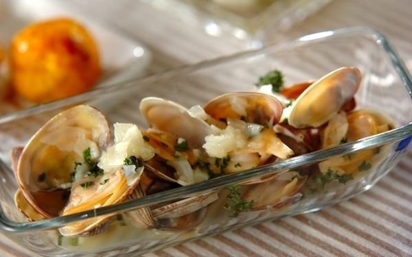 ニンニクやショウガを効かせたハマグリのワイン蒸しは、お酒のおともにもってこいです。ハマグリの身がぷっくりしてきたら火が通った目安。器に取り出し、煮詰めた蒸し汁にバターでコクをプラスしましょう。蒸し汁が多いときは、茹でたパスタにからめてペペロンチーノ風にアレンジするのも◎です。