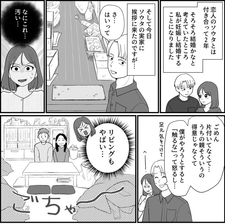私たちは挨拶のためにソウタの実家を訪れました。玄関を入ると、目に飛び込んできた光景に息を飲みました。脱ぎっぱなしの靴、散乱した雑誌、とにかく物が多く、掃除がされていないことは明らかでした。私はやや抵抗がありながらも、すすめられた場所に座りました。
