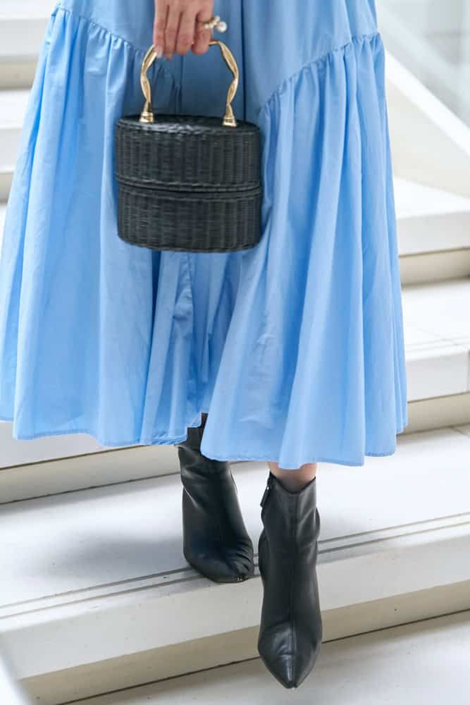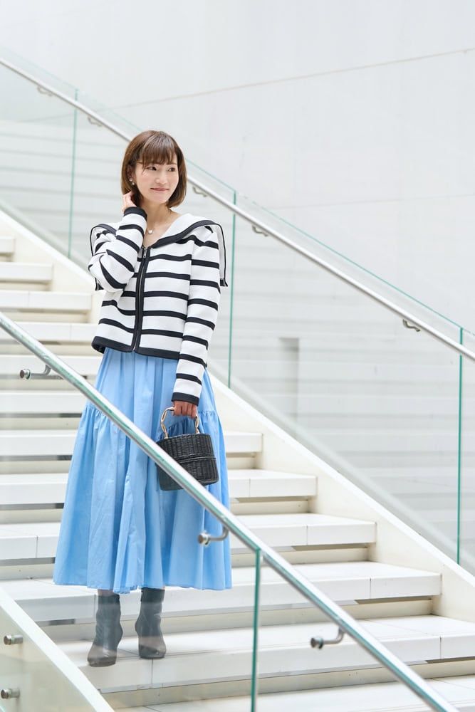 大人可愛いセーラーカラーのカーディガンを主役に爽やかなブルーのスカートを合わせて、甘すぎない清潔感を意識しました。ボーダーの黒を拾って小物を黒でまとめることで、全体を引き締めて統一感のあるコーデに。コーディネートを考える時は常に「人からどう見られるか」を考えているので、好感度や親しみやすさを大切にする「領事」ファッションがとてもしっくりきます。