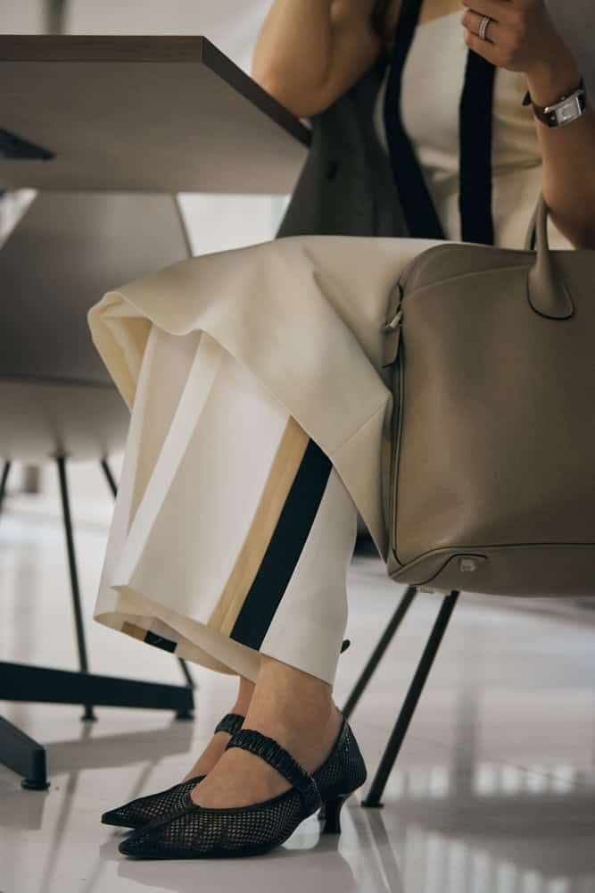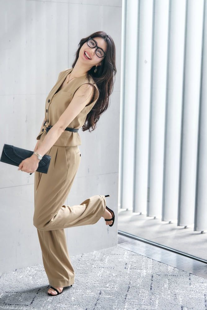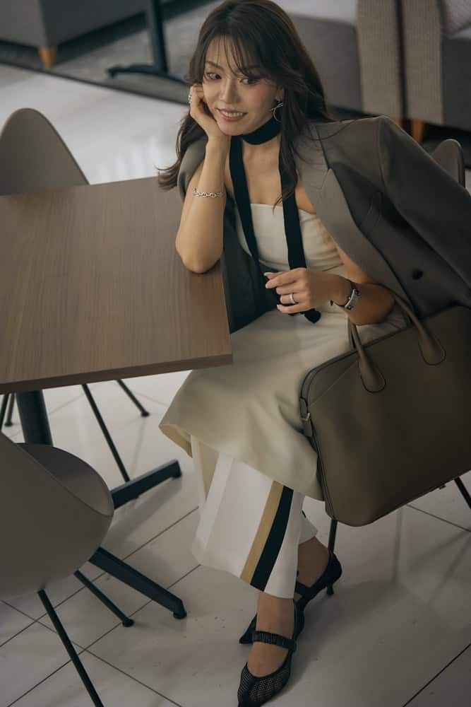 トレンドのラインパンツにベアトップのワンピースをレイヤードさせてオーバーサイズのジャケットを羽織り、メンズライクなアイテムだけど女性らしさも感じさせてくれるコーデに。服と靴は注目している韓国ブランドのもので、メンズライクがトレンド真っ只中!まさに今の気分とマッチしているんです♪ファッションは直感タイプで一目惚れが多いけど、トレンドを取り入れつつも自分らしさも大切にしています。