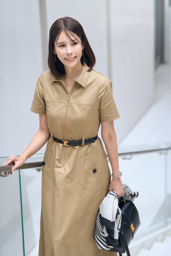 きちんと見えするトレンチワンピースは、一枚でパッと着映えするところがお気に入り。少し印象を強くしたい時は、付属の共布ベルトをセリーヌのベルトに変えてアクセントをプラス。TPOに合わせて小物やアレンジで雰囲気の変化を楽しんでいます。小物を黒でまとめて好感度と華やかさのバランスを整えれば、初めましてや目上の方とお会いするシーンにもピッタリ!ファッションに好感度も今っぽさも求めるところが「主人公」っぽいですよね。