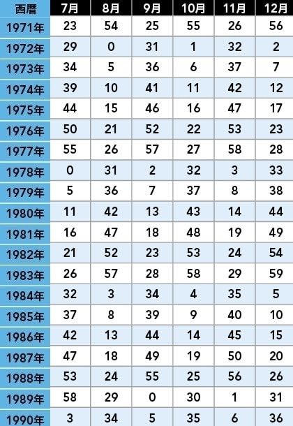 1.下の図で、生まれた年と生まれた月が交差する位置の数字を探します。