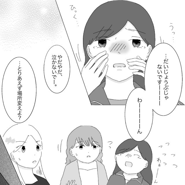 女の子たちの優しさが心に染みて、さらに涙が溢れてしまいます。尋常じゃない泣き方に「やだやだ、泣かないでー」と焦る2人。顔見知り程度の関係だけど、このまま見過ごせないと思ったのか、「とりあえず場所変えよ?」と近くのカラオケに連れて行ってくれました。