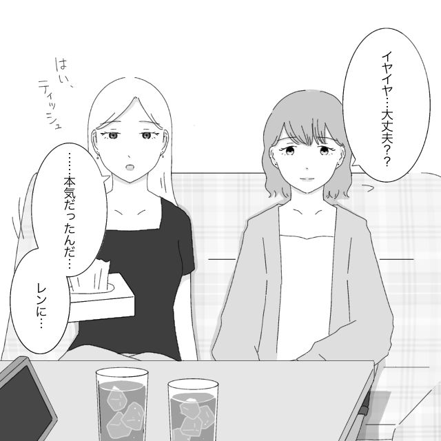 レンにフラれたのが原因で、ほぼ初対面の人の前でこんなに取り乱してしまった・・・我ながらどうしようもないくらい情けない。でも2人はそんなこと気にする様子もなく、「イヤイヤ・・・大丈夫?」と声をかけてくれました。そしてティッシュを差し出すと「本気だったんだ・・・レンに」と言いました。